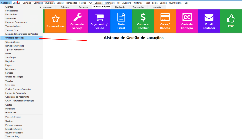 No menu principal do Sistema Empsis, clique em Cadastros e selecione a opção Unidades de Medida.