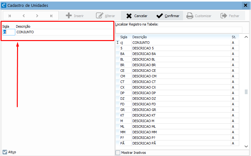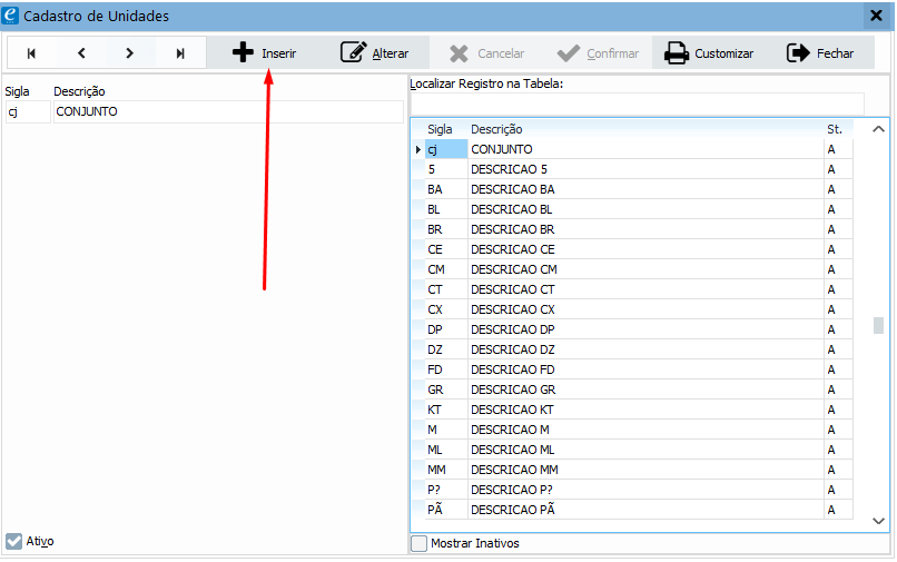 Na tela de Cadastro de Unidades, clique no botão Inserir para adicionar uma nova unidade de medida.