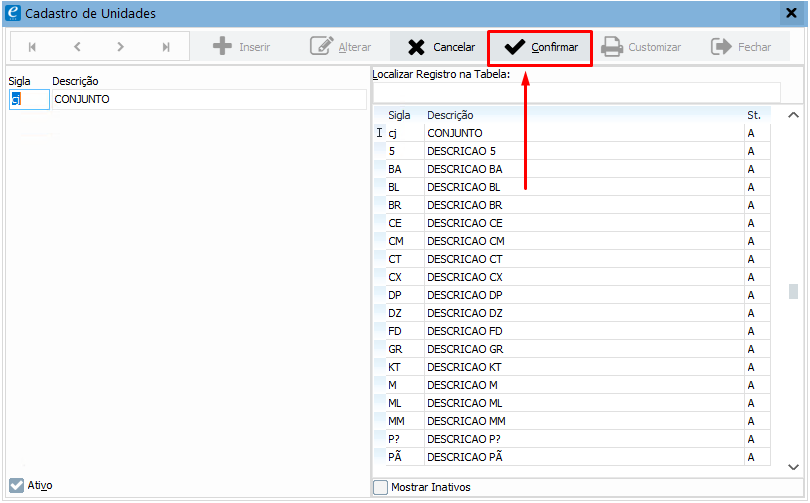 Após preencher as informações, clique no botão Confirmar para salvar a unidade de medida no sistema.