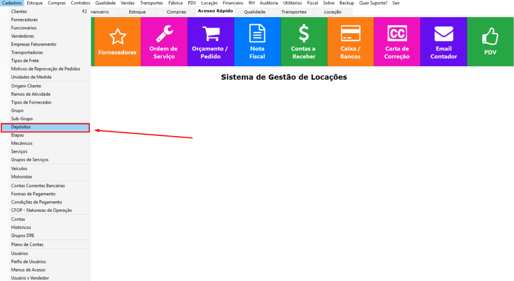 O cadastro de depósitos permite organizar e controlar os locais onde os produtos são armazenados dentro da empresa.