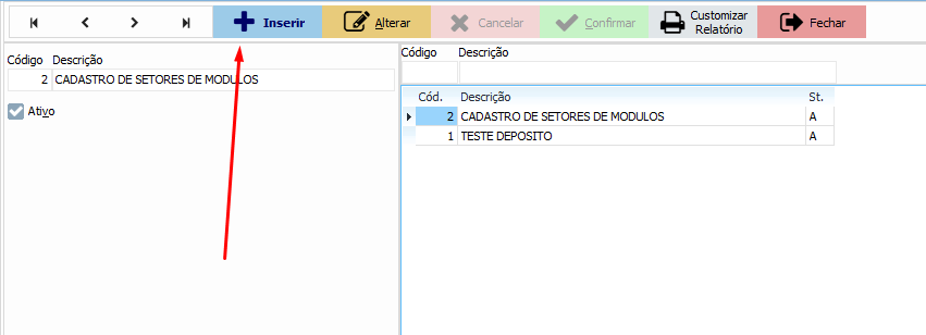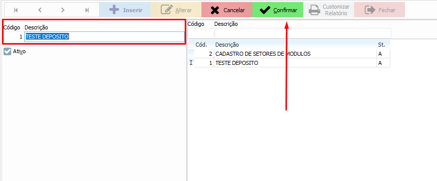 O depósito criado será exibido na lista à direita, junto com os demais já cadastrados.