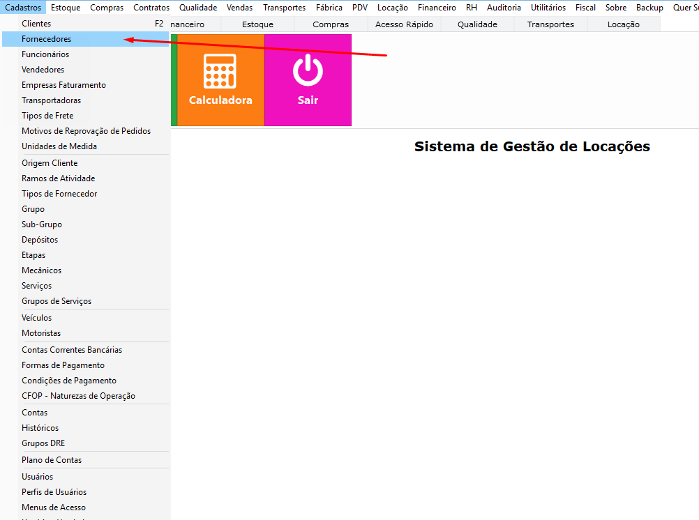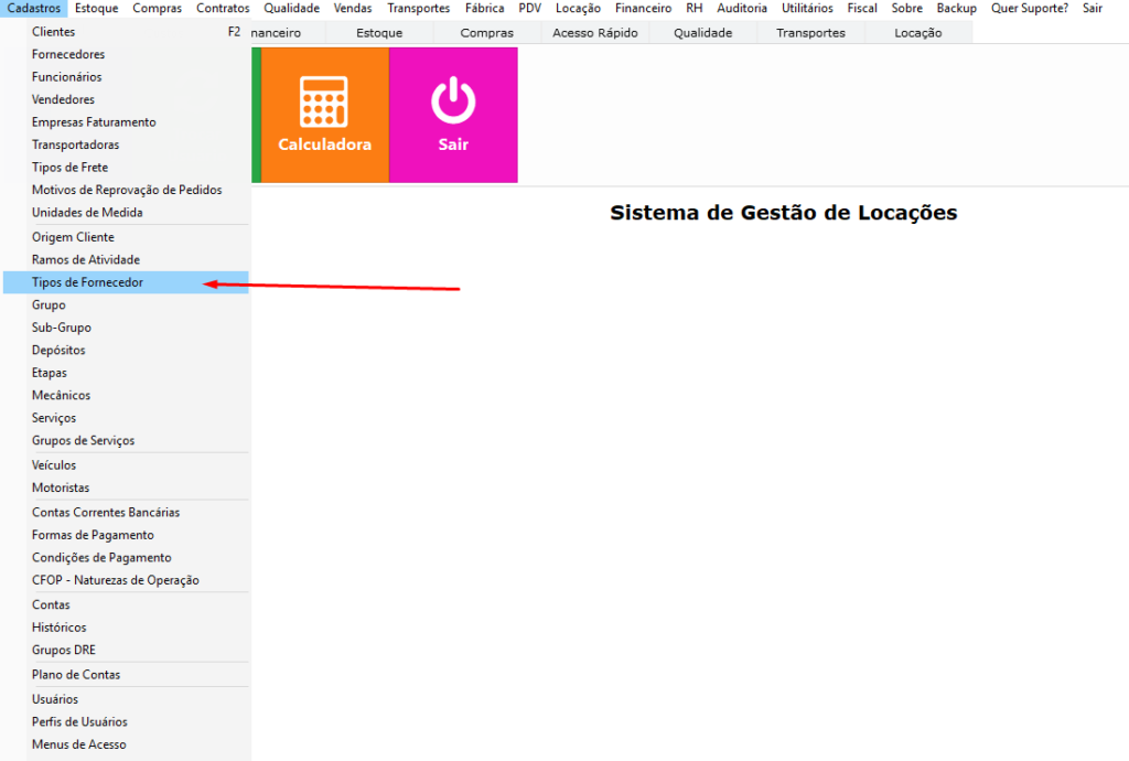 No menu superior, vá em Cadastros → Tipos de Fornecedor