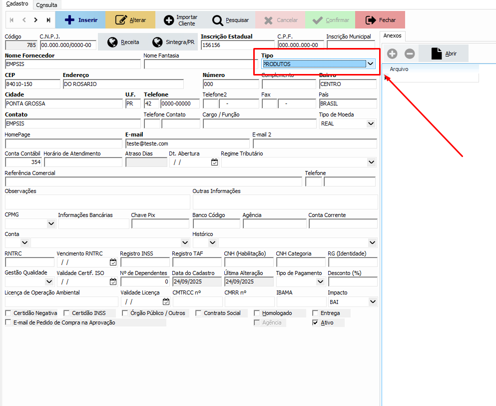 na tela de cadastro de um novo fornecedor, o campo “Tipo” já exibirá as opções criadas anteriormente, permitindo selecionar o tipo adequado de cada fornecedor.