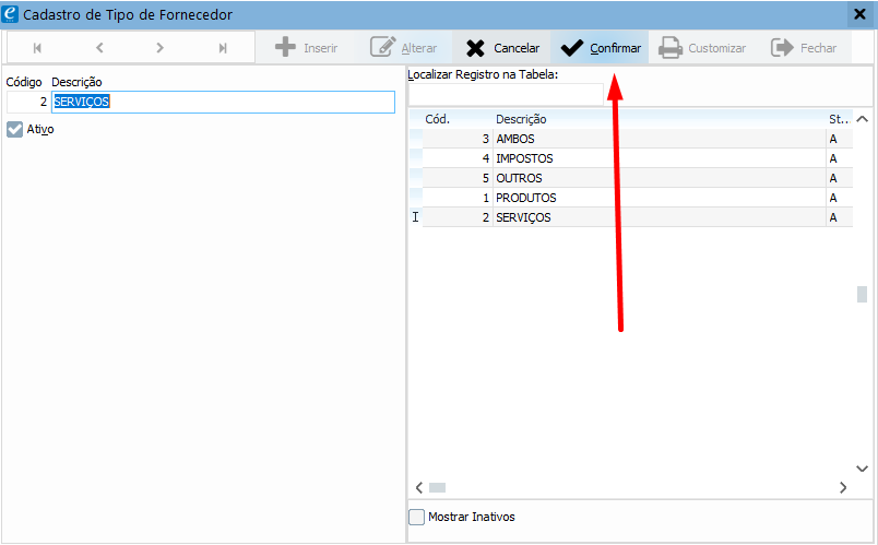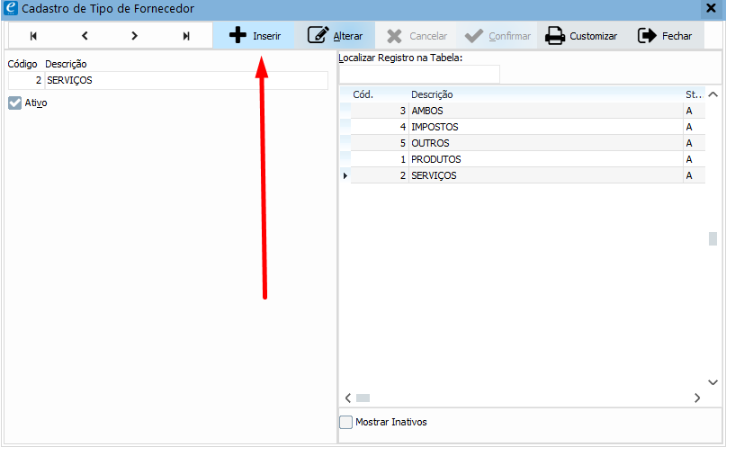 Clique em “Inserir” para criar um novo tipo de fornecedor.