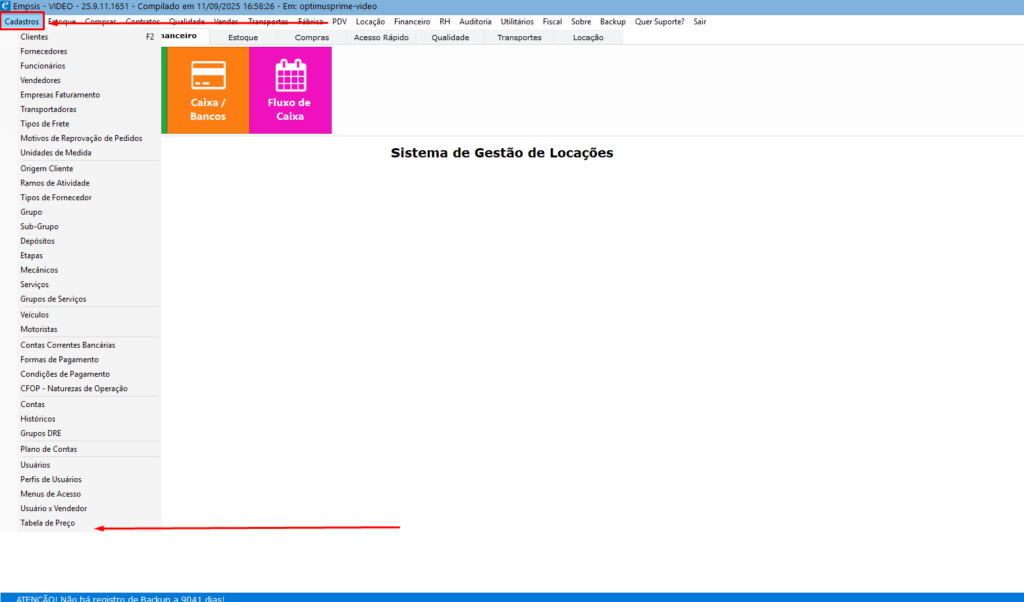 No menu principal, clique em Cadastros e, em seguida, selecione a opção Tabela de Preço localizada no final da lista.