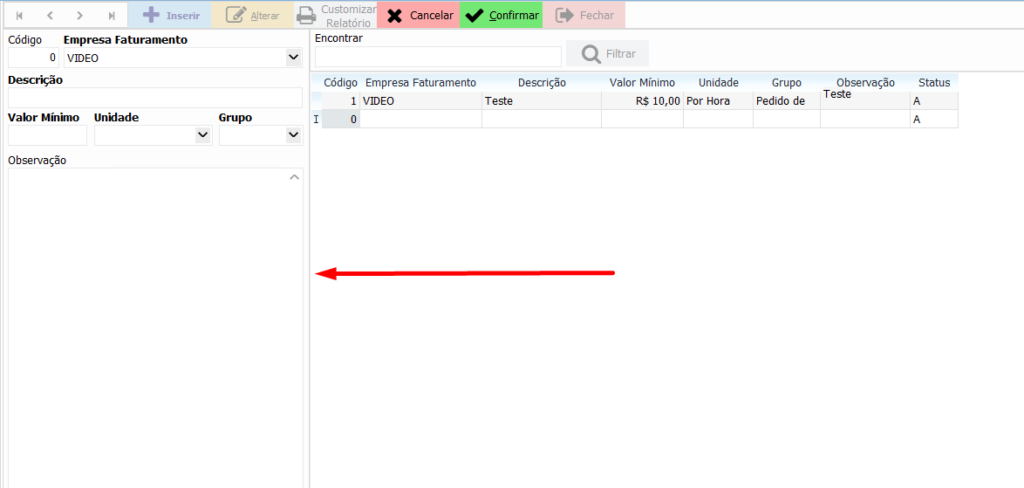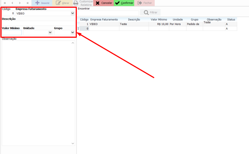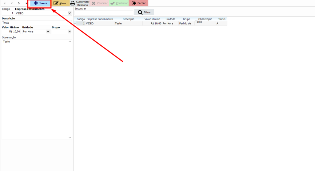 Na tela de Tabela de Preço, clique no botão Inserir para criar um novo registro.