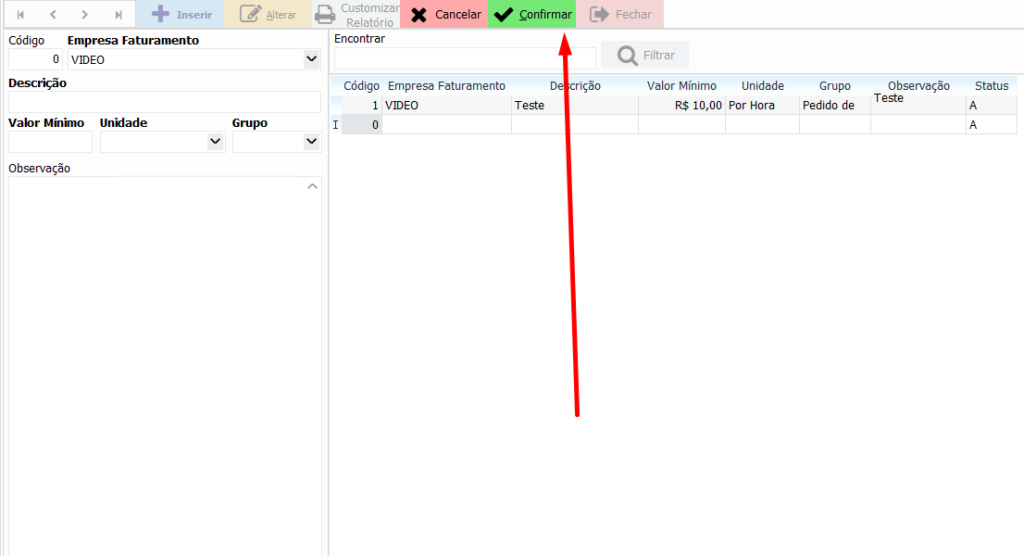 Último Passo: Confirmar o cadastro da Tabela de Preço