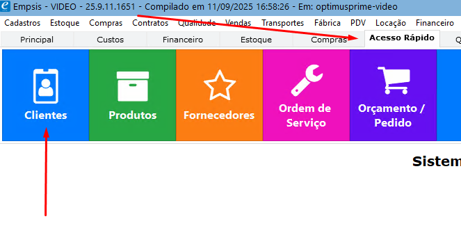Conforme imagem acima, no Sistema Empsis, você precisa ir na aba “Acesso Rápido” e clicar no botão “Clientes”, veja os passos a seguir: