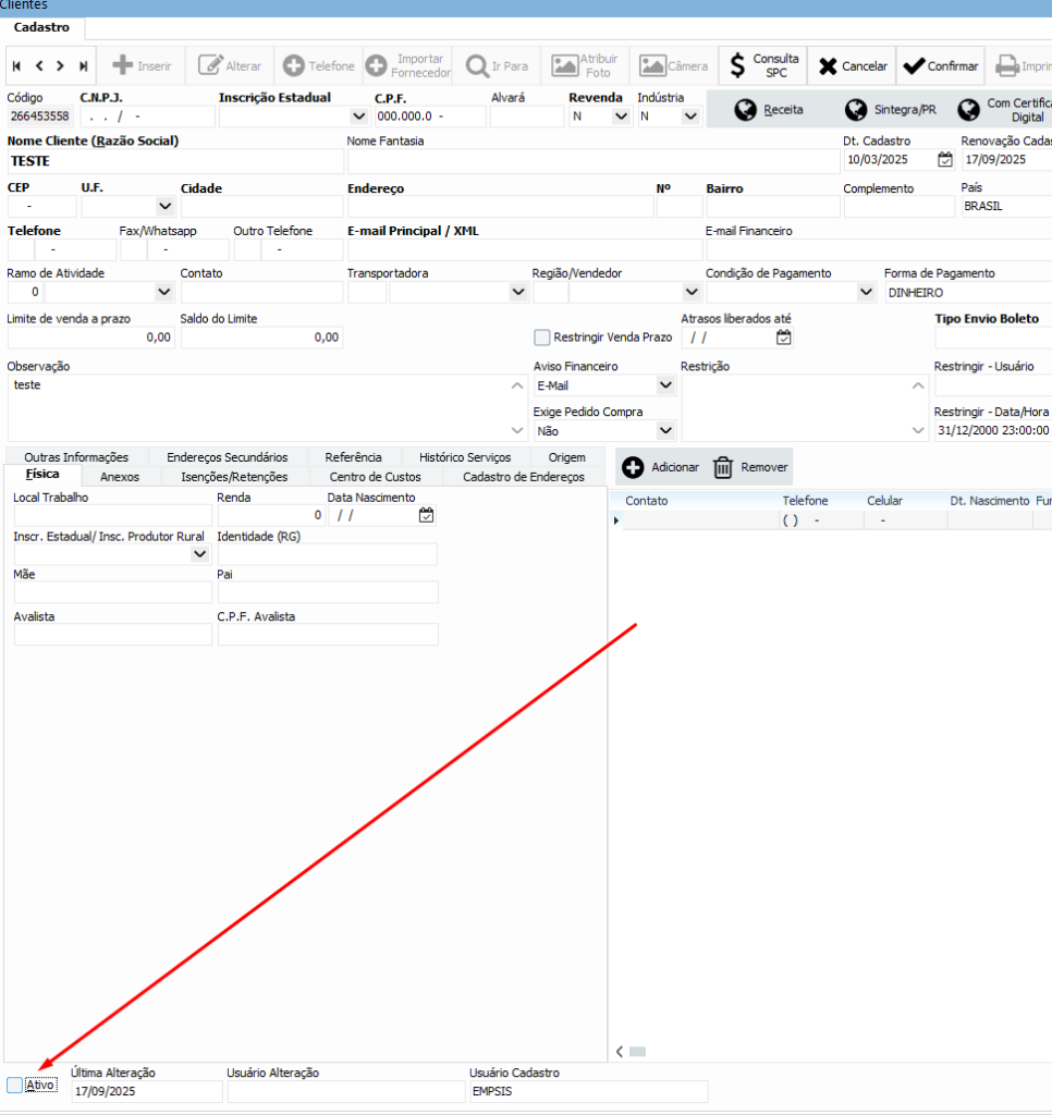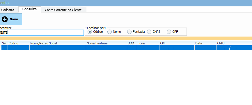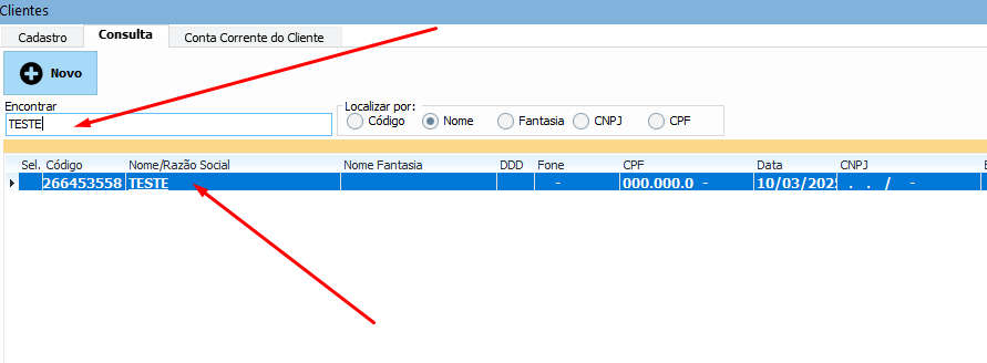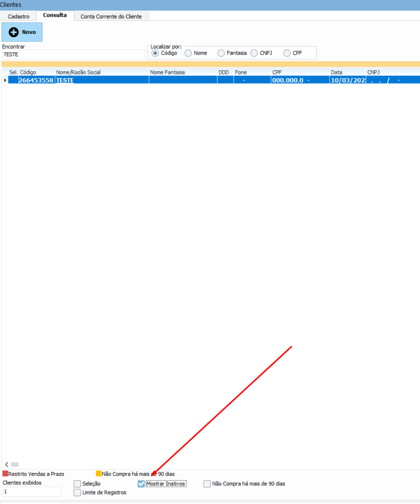 Agora o cliente inativo pode ser encontrado na consulta, e para ativá-lo, basta repetir o processo anterior marcando novamente a caixinha Ativo no seu cadastro.