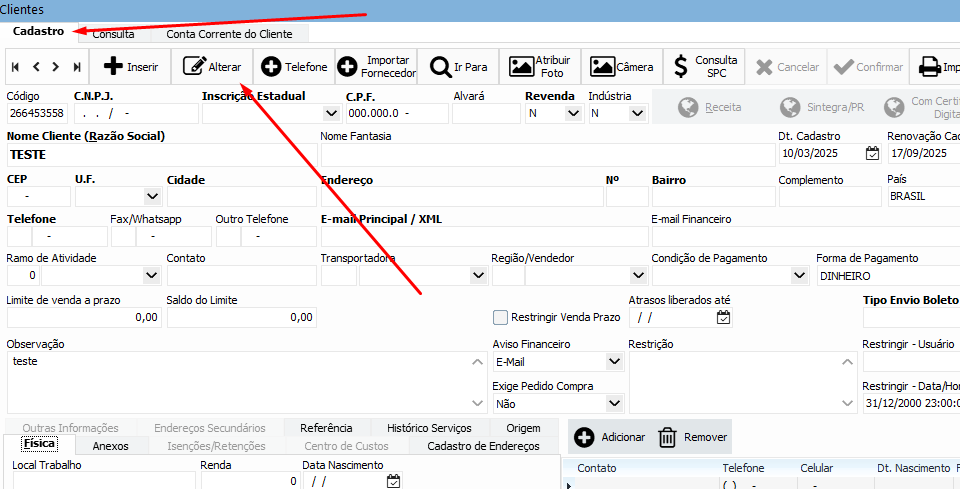 Depois clique na aba Cadastro e depois no botão Alterar: