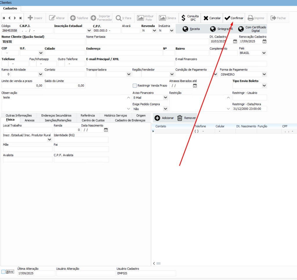 Segundo passo, clique no botão Confirmar para finalizar a inativação do cliente: