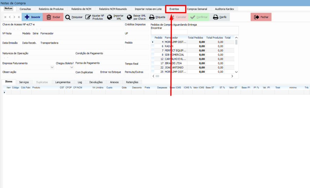 Após acessar o módulo, você será direcionado para a tela de Notas de Compra.