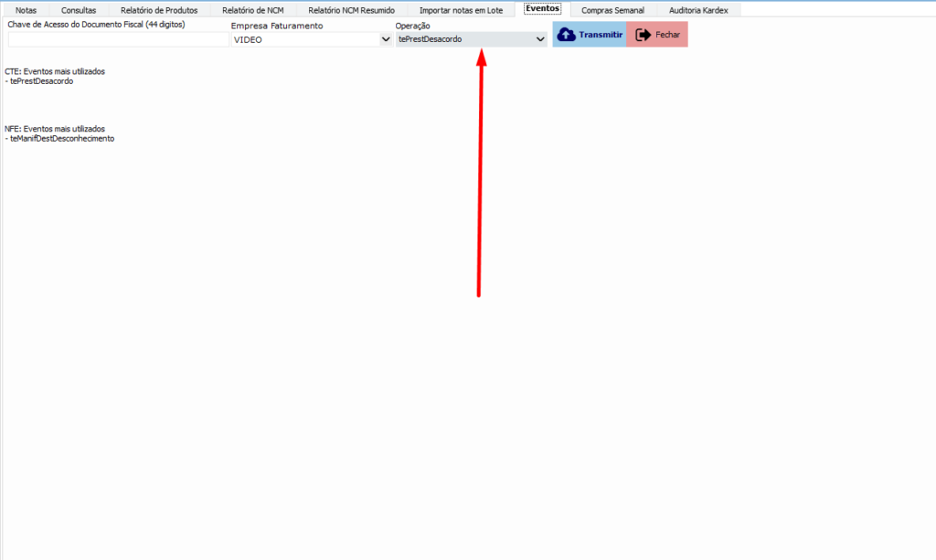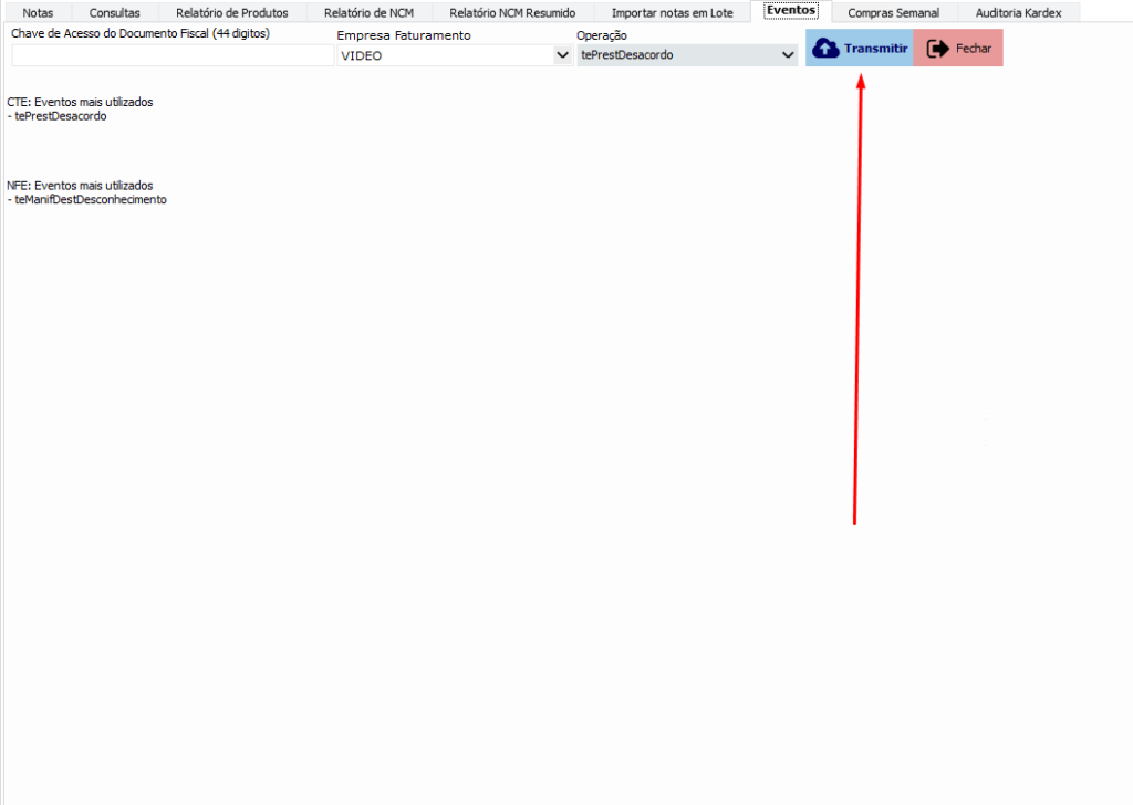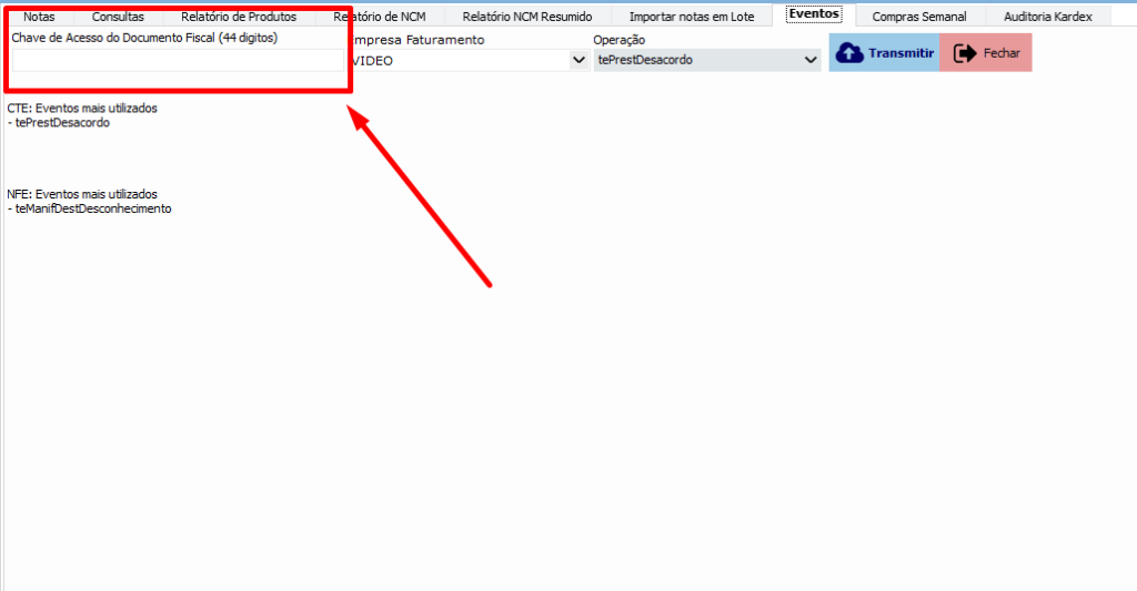 Na tela de Eventos, insira corretamente a Chave de Acesso do Documento Fiscal (44 dÃgitos) no campo indicado.