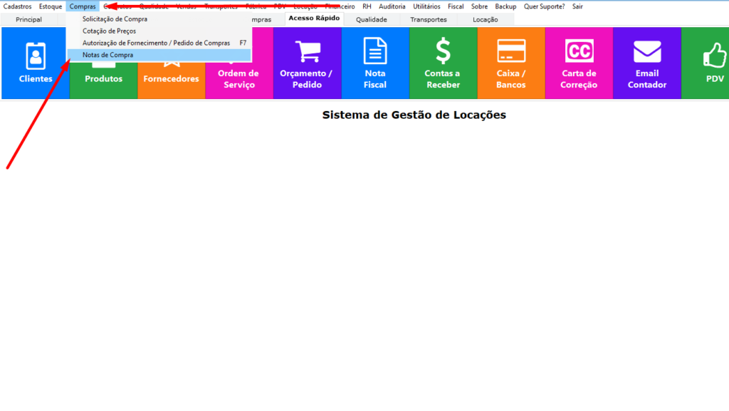 Primeiro passo: Acessar o menu de Compras. No menu superior do Sistema Empsis, clique em Compras e depois selecione a opção Notas de Compra.