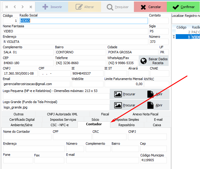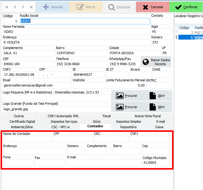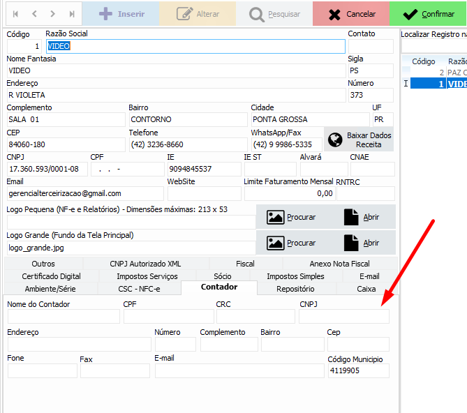 Segundo passo, preencha os campos Nome do Contador, CPF, CRC, CNPJ (o mais importante), Endereço, Número, Bairro, CEP, Fone e E-mail:
