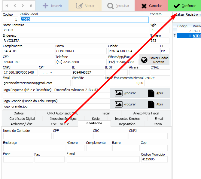Último passo, clique no botão Confirmar para finalizar o preenchimento dos dados do contador:
