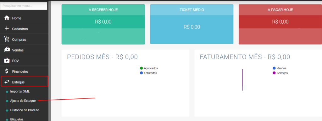 No menu lateral, clique em Estoque → Ajuste de Estoque.