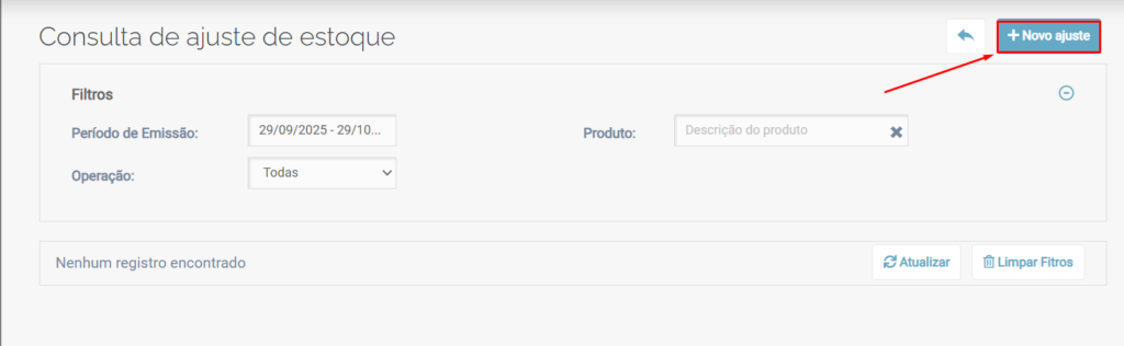 Clique em + Novo ajuste para registrar uma nova movimentação de estoque.
