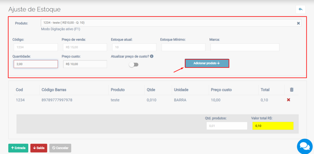 - O sistema exibirá automaticamente o código, estoque atual, preço de venda e preço de custo.