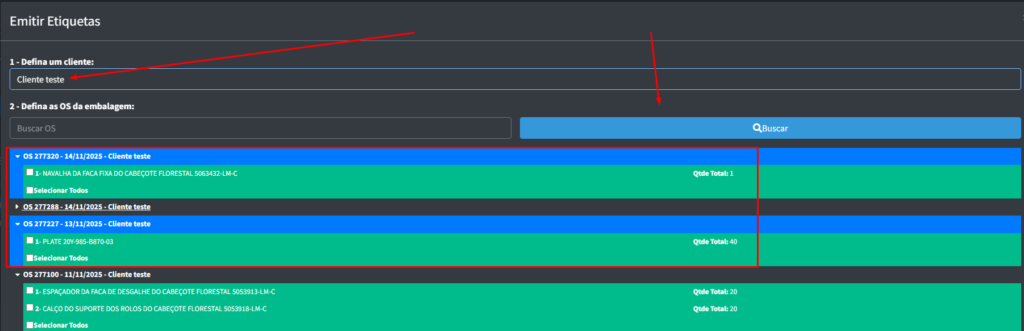 • Localize e marque as caixas de seleção das Ordens de Serviço (OS) que deseja etiquetar.