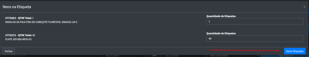 O sistema mostrará um resumo dos itens selecionados. Verifique a quantidade de etiquetas para cada item e clique no botão azul Gerar Etiquetas.