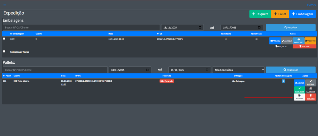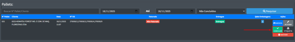 Com as embalagens assinadas, o próximo passo é consolidar o Pallet. Verifique se a embalagem correta está listada (selecionando-a se necessário para vincular) e clique no botão Concluir para fechar o Pallet.