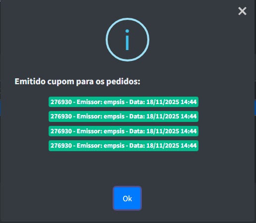 O sistema exibirá uma mensagem de sucesso informando que o cupom foi emitido. Clique em Ok.