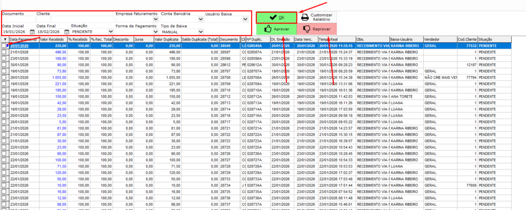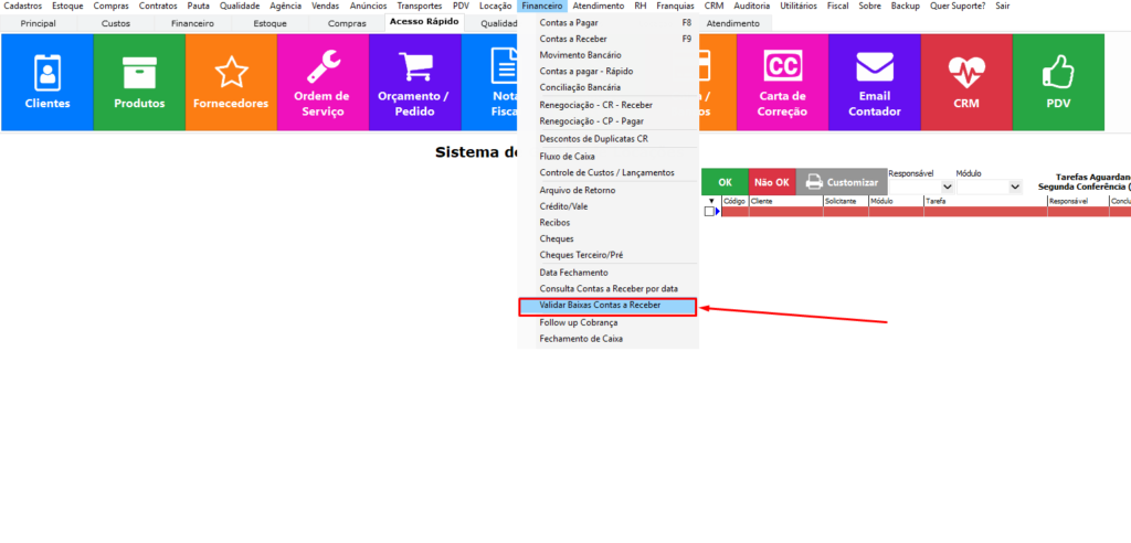 Quarto passo – Financeiro → Validar Baixas Contas a Receber