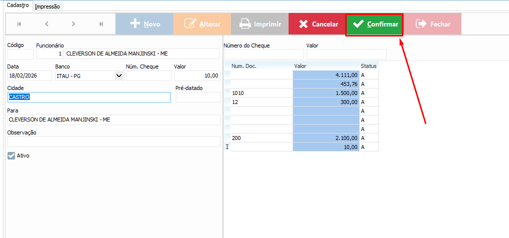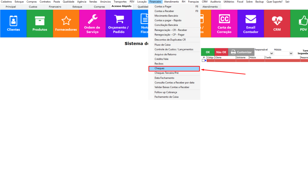 Primeiro passo – Financeiro → Cheques