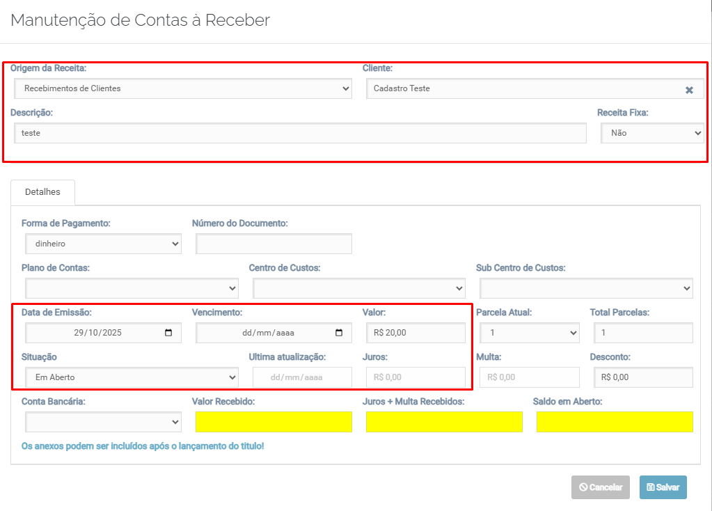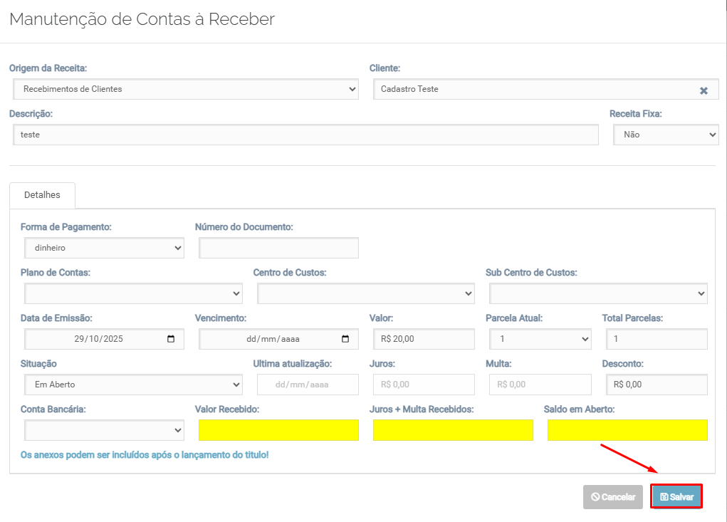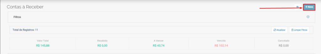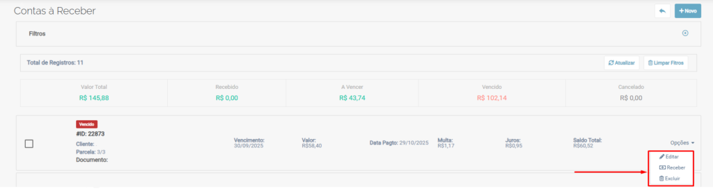 Com o registro criado, o título aparecerá na listagem, permitindo editar, excluir ou dar baixa no pagamento.