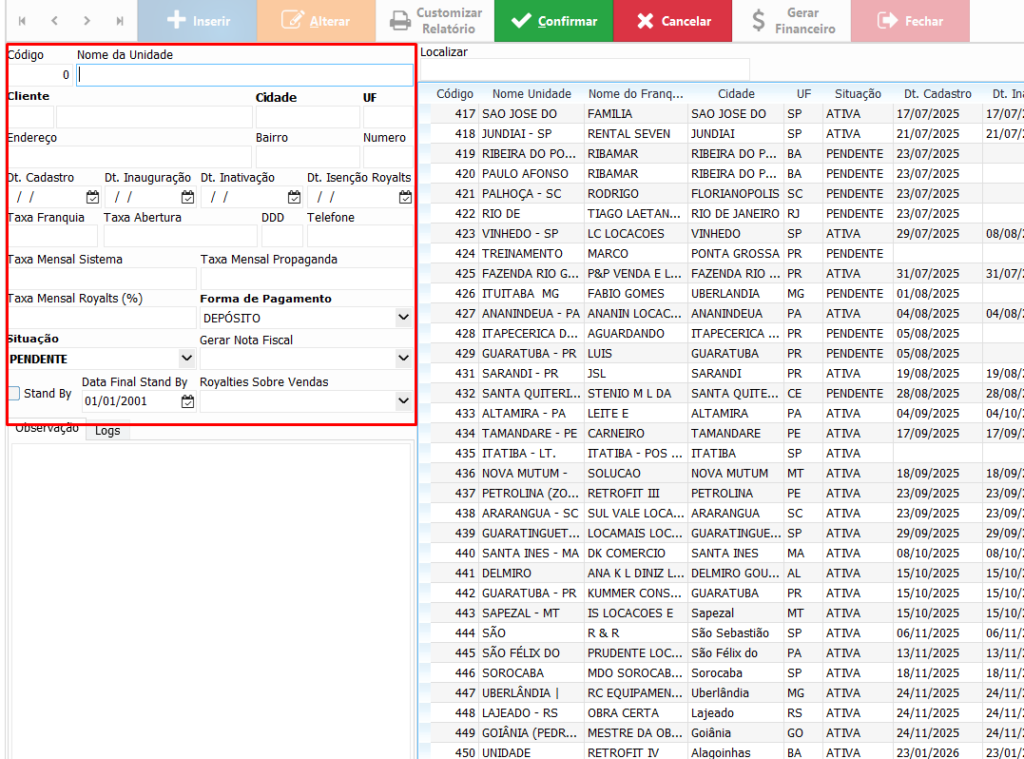 Esta opção permite acessar o cadastro completo das unidades franqueadas, onde é possível: