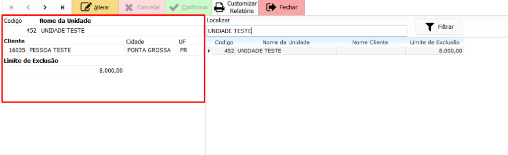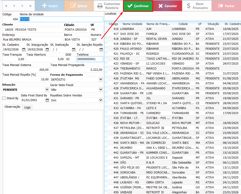 Esta é a tela de cadastro da unidade franqueada, onde são exibidas informações como: