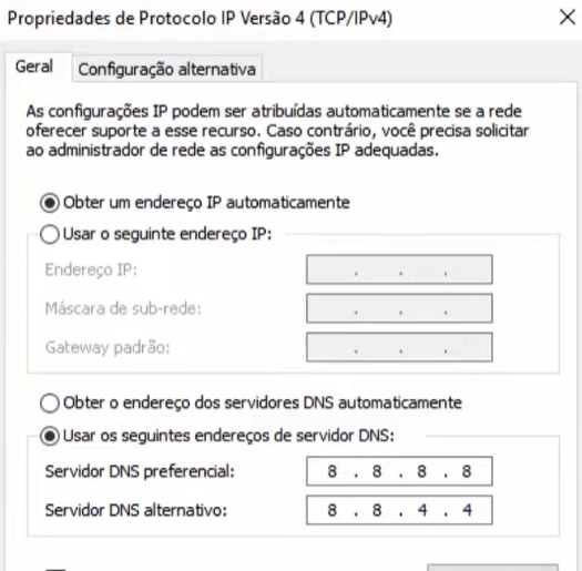 Na seção DNS, marque Usar os seguintes endereços de servidor DNS.