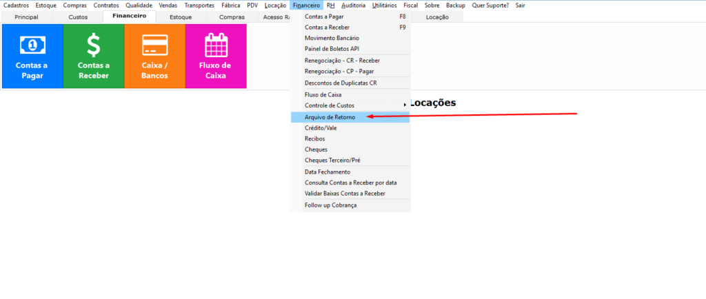 No menu principal, acesse Financeiro → Arquivo de Retorno.