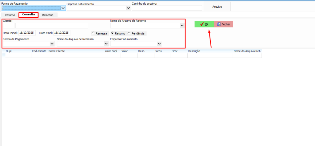 Na aba Consulta, é possível detalhar as informações retornadas pelo banco, filtrando por: