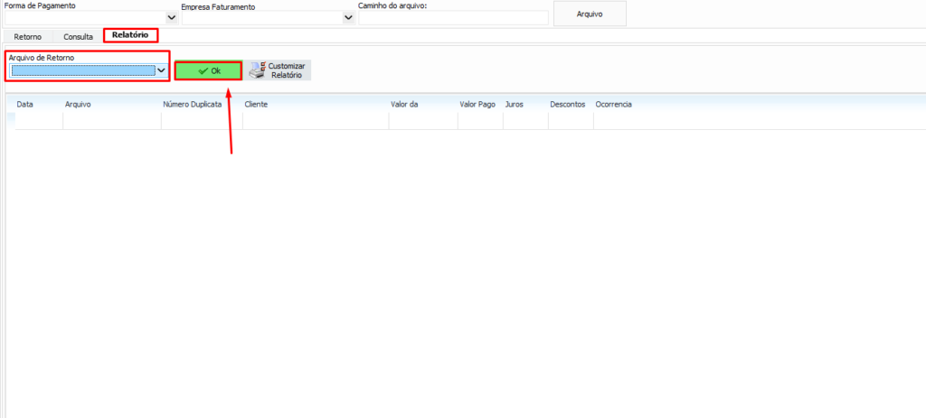 Na aba Relatório, selecione o Arquivo de Retorno desejado e clique em OK para visualizar o relatório completo de duplicatas com os respectivos valores pagos, juros, descontos e ocorrências.