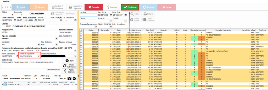 Após localizar a locação correta, clique sobre o registro para selecioná-lo.