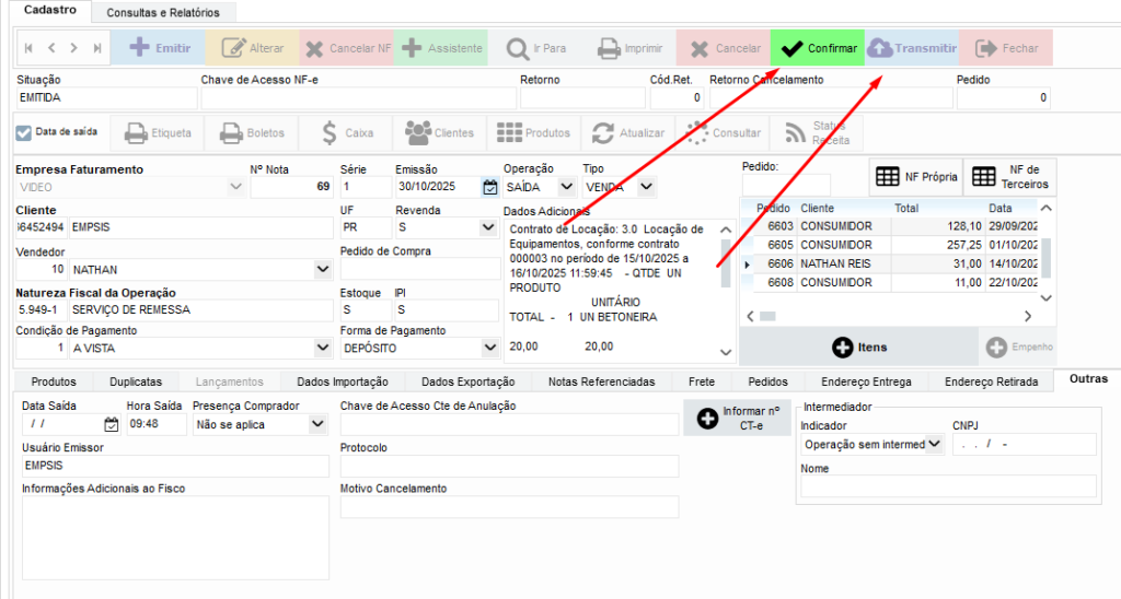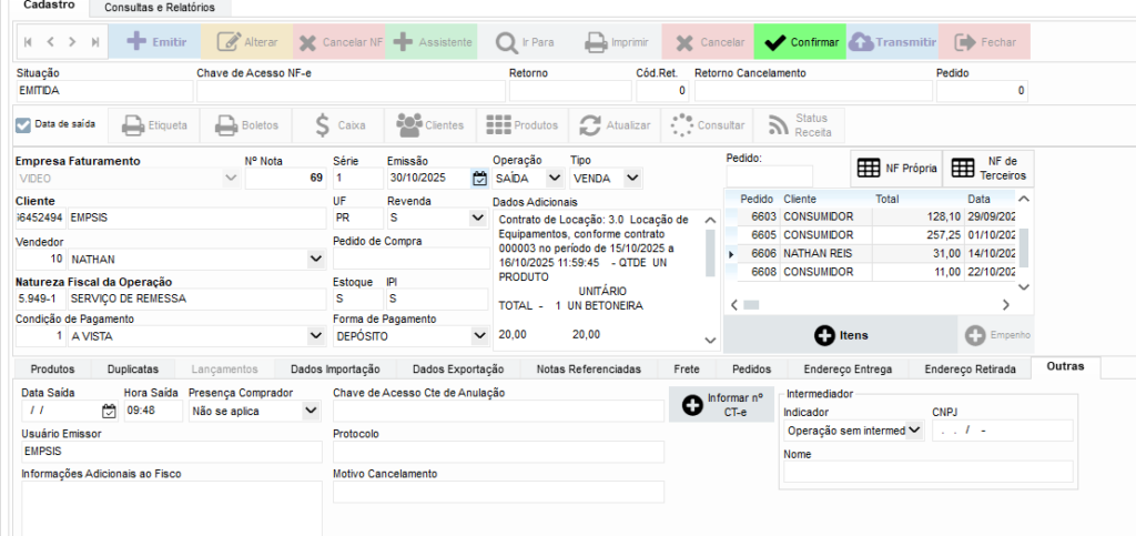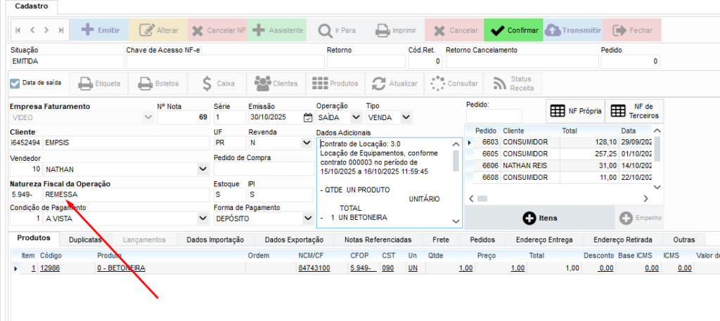 Feito isso, as informações do contrato de locação serão importadas para a nota de Remessa que está sendo gerada: