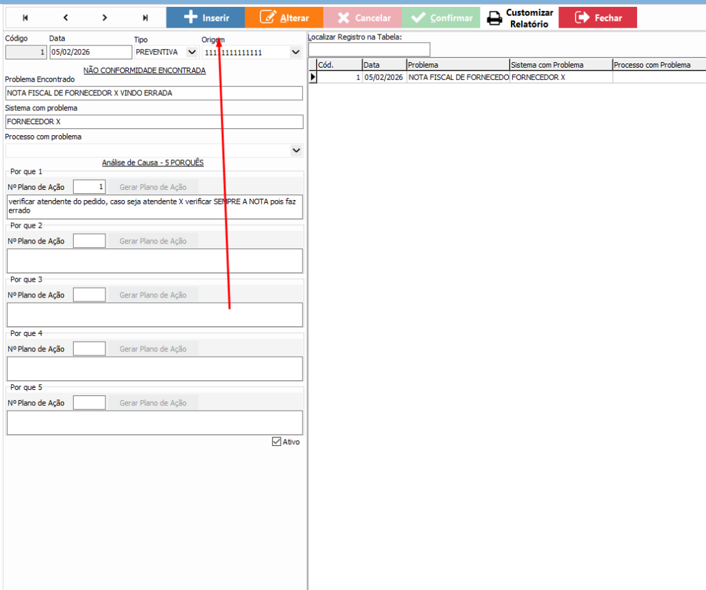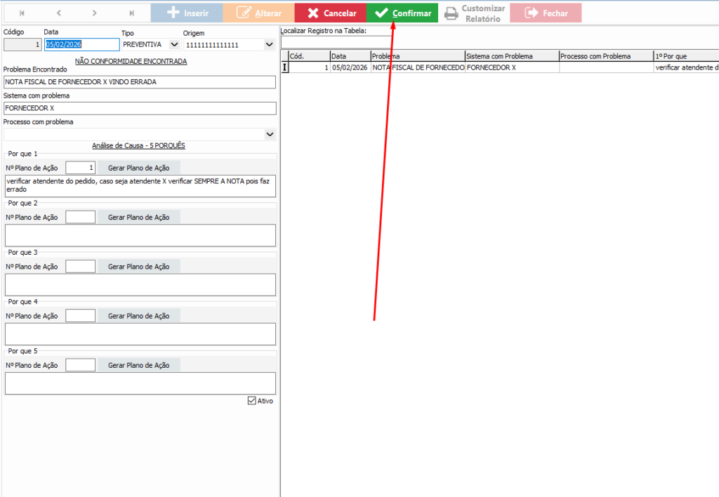 Este módulo permite registrar ocorrências (não conformidades) e realizar a análise detalhada da causa do problema, estruturando ações corretivas e preventivas.