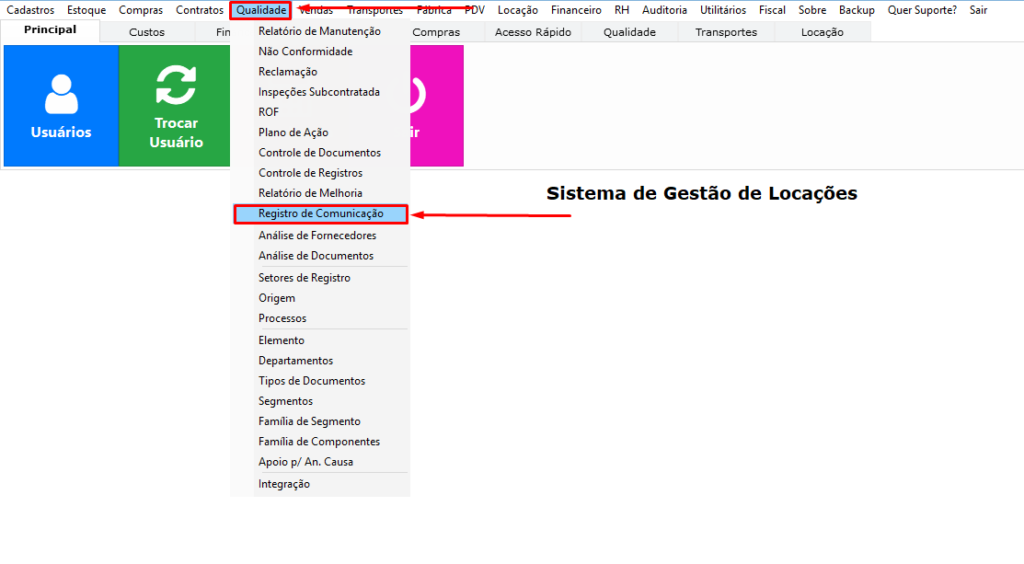 No menu principal, acesse Qualidade → Registro de Comunicação.