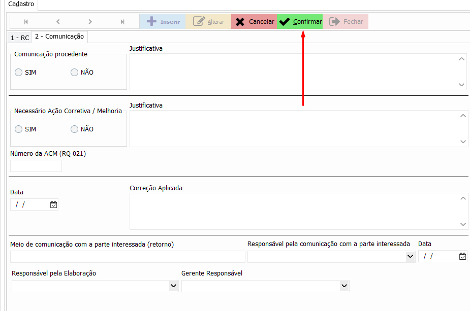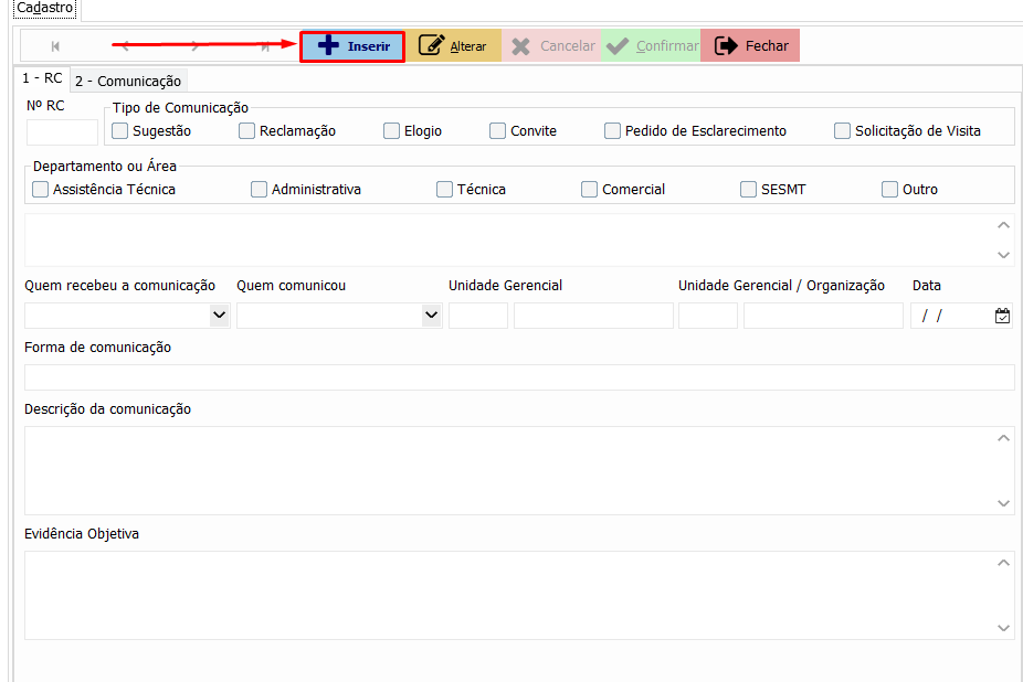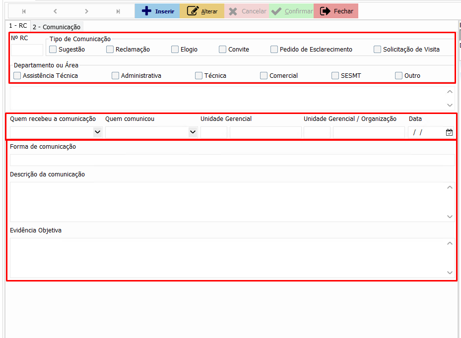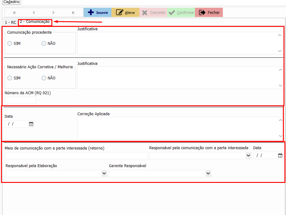 Após o registro inicial, acesse a Aba 2 – Comunicação para analisar o conteúdo recebido e preencher as informações complementares: