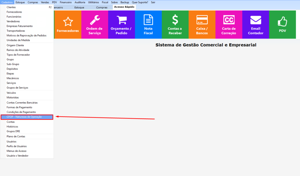 Primeiro passo – Cadastro -> CFOP -> Naturezas da Operação
