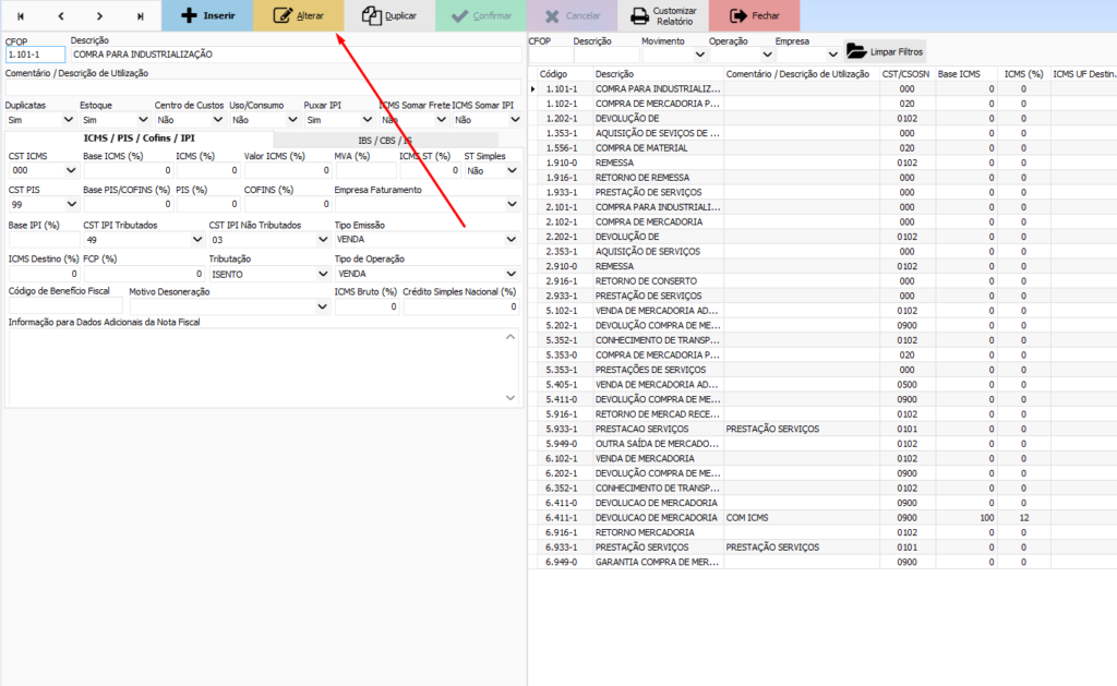 Na grade/lista da direita, selecione o CFOP que deseja configurar. Clique em Alterar para editar o CFOP selecionado