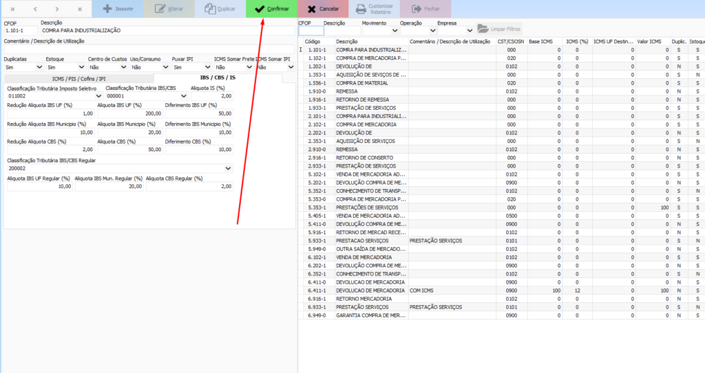 Isso grava o IBS/CBS dentro daquele CFOP e passa a valer para as emissões que usarem essa natureza.