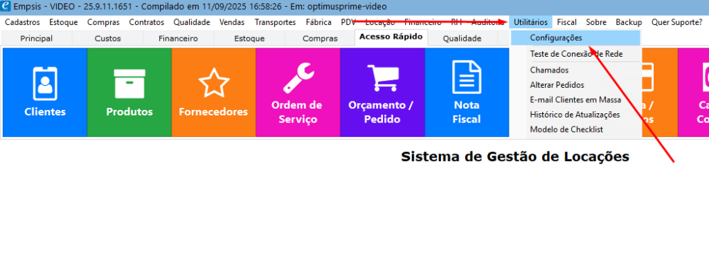 Conforme imagem acima, no Sistema Empsis, clique no menu “UtilitĆ”rios” e depois clique na opção “ConfiguraƧƵes”, veja os passos a seguir: