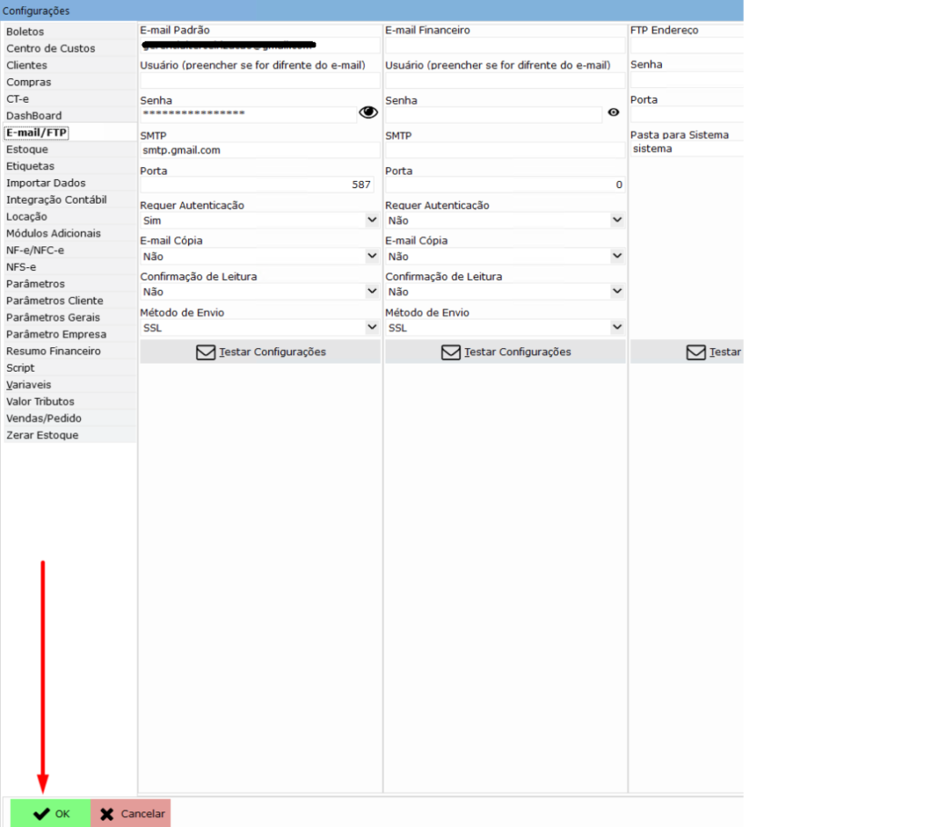 Ćltimo passo, agora clique no botĆ£o Testar ConfiguraƧƵes para receber um e-mail teste. Após receber o e-mail, a configuração estĆ” finalizada, clique no botĆ£o OK para finalizar:
