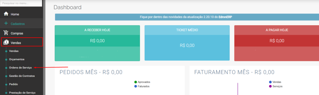 No menu lateral, clique em Vendas → Ordens de Serviço.
