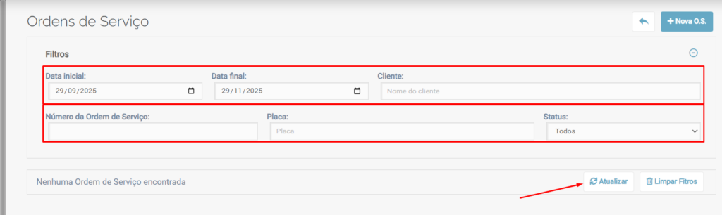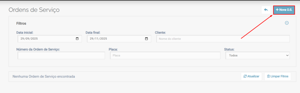 Caso não haja nenhuma ordem registrada, clique em + Nova O.S. para iniciar um novo cadastro