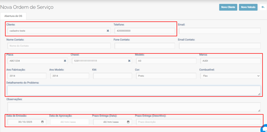 Inclua também o detalhamento do problema, observações e as datas de emissão e entrega.