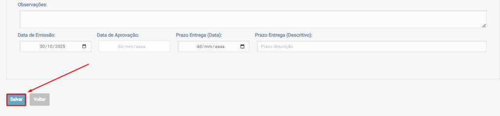 Após preencher todas as informações, clique em Salvar para registrar a ordem no sistema.